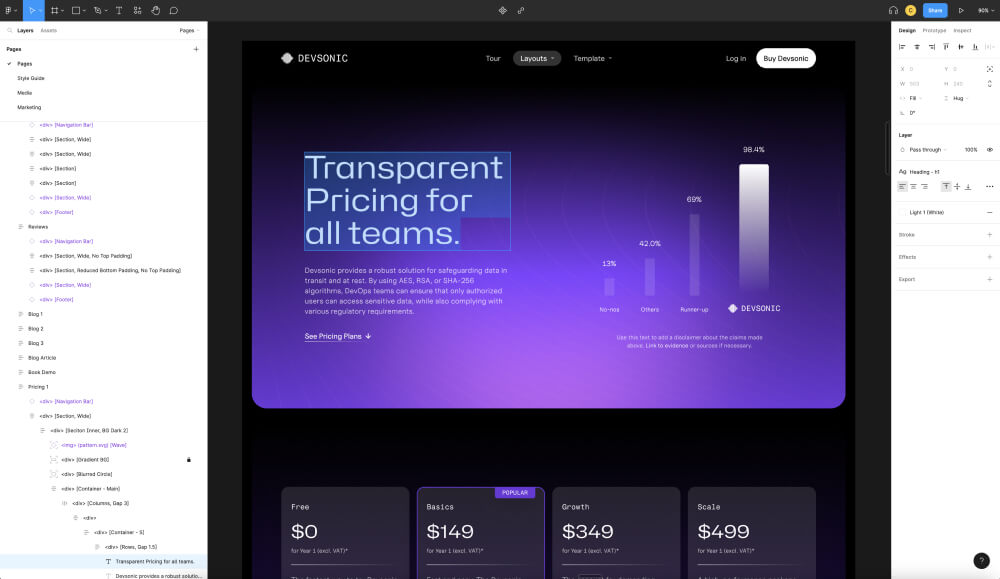 The Figma design for Devsonic is available to purchase separately, or comes included via redemption when you purchase the Webflow version. Our Figma files are neatly organised and simple to modify.